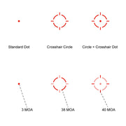 - Reticles: 3 MOA Dot / Crosshair / Circle / Circle+Dot